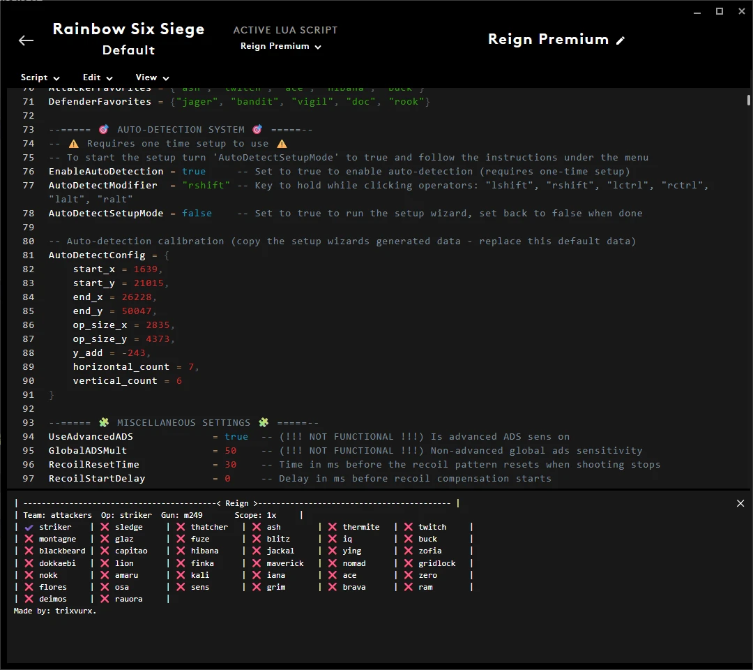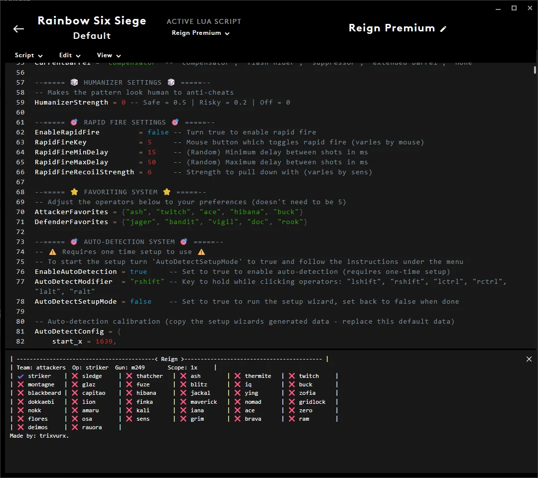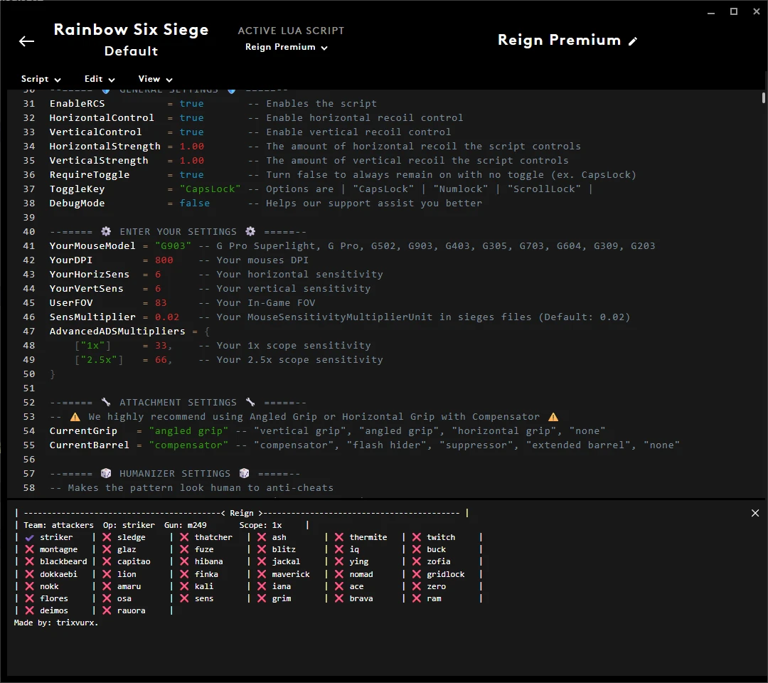 ▸ Automatically detects when you swap operators ▸ Menu contains (teams, operators, weapons, scopes) ▸ Works With Every Dpi / Sens / Sens multiplier / FOV etc. ▸ Customize your attachments (supports all) ▸ Fully Adjustable Rapid Fire ▸ Attack / Defense Mode Switching ▸ Fully Adjustable Operator Favoriting System ▸ Comes With an Adjustable Humanizer
